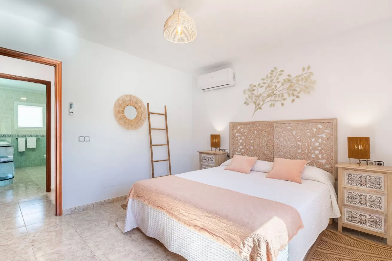 La camera da letto principale ha un letto matrimoniale, armadi a muro e aria condizionata.