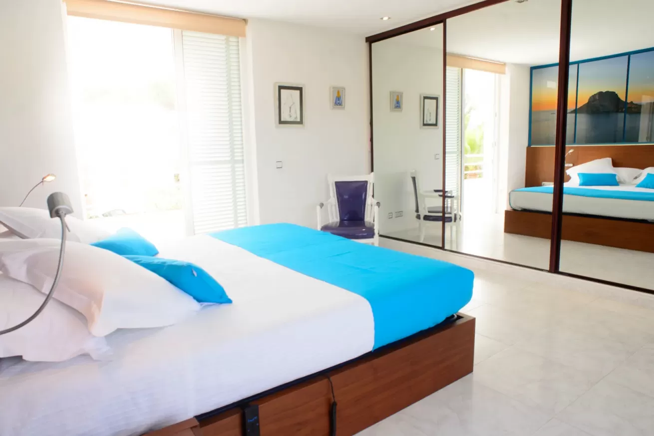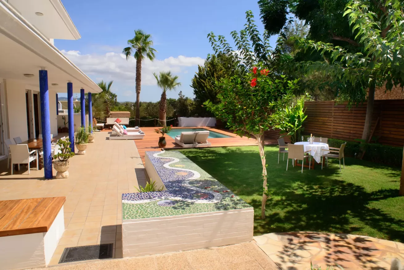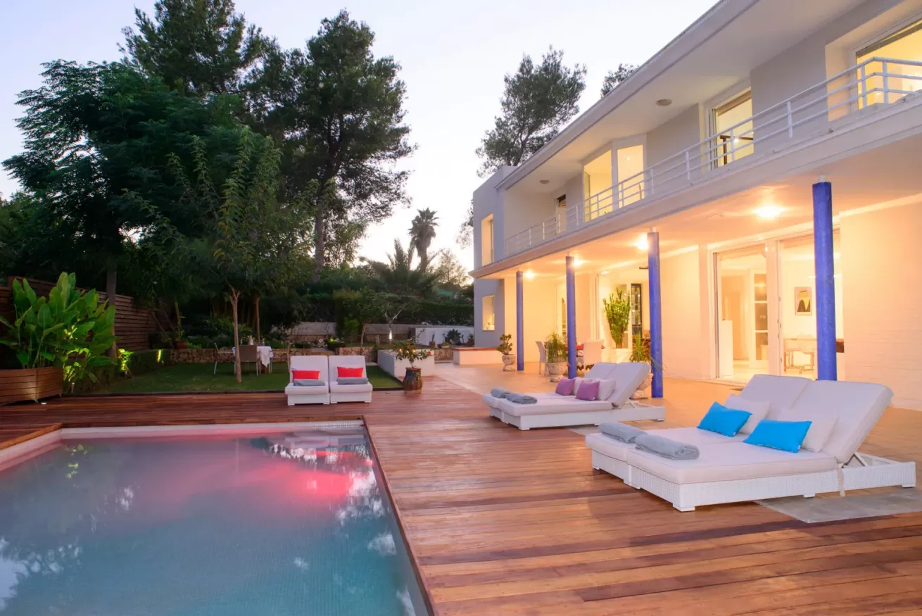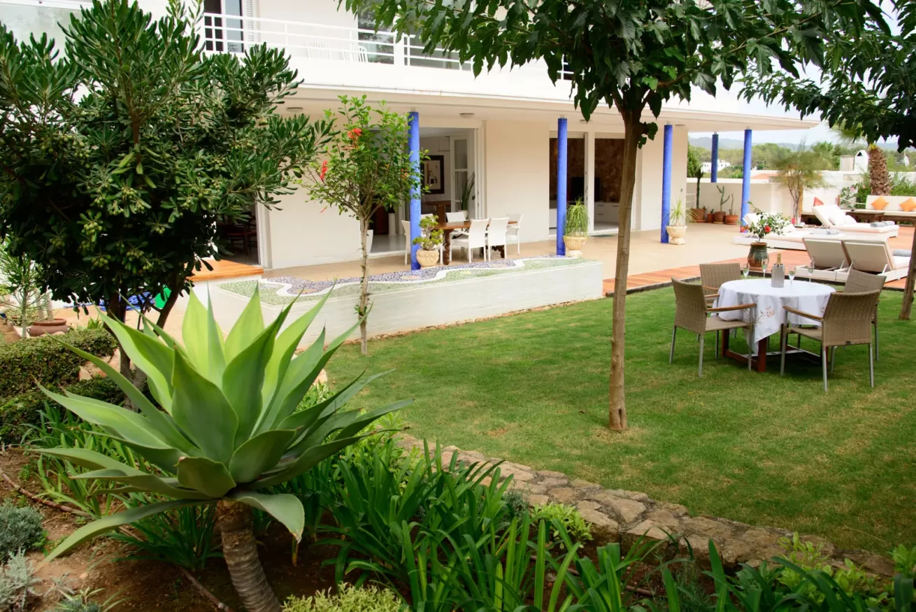 Villa Ariel è un gioiello situato a nord-ovest dell’isola, a pochi passi da Cala de Bou e dalle meraviglie di San Antonio. Le sue pareti, dall'intonaco candido, sembrano accogliere i raggi del sole con un sorriso, mentre la brezza si insinua delicatamente tra le fronde degli alberi circostanti.