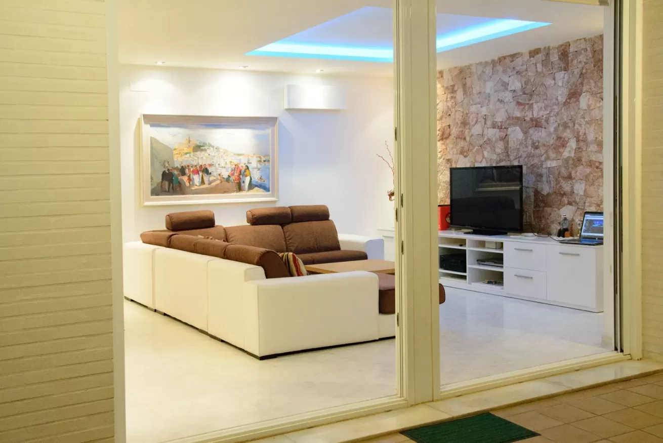 Al suo interno, Villa Ariel è un rifugio di pace e serenità. Divisa su due piani, è perfetta per ospitare famiglie e gruppi di amici fino a 9 persone. L'ingresso, imponente e accogliente, conduce al livello inferiore. Qui, la zona living si apre come un abbraccio caloroso, con una sala da pranzo accogliente e una zona relax arredata con morbidi e accoglienti divani.