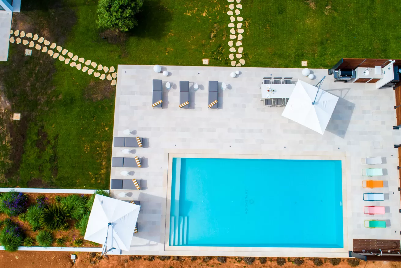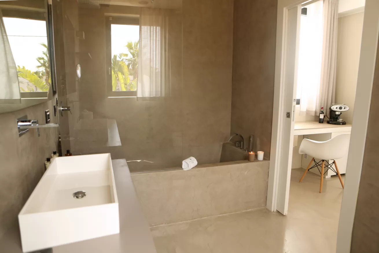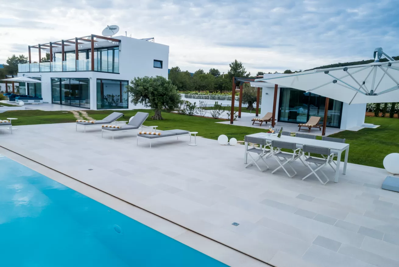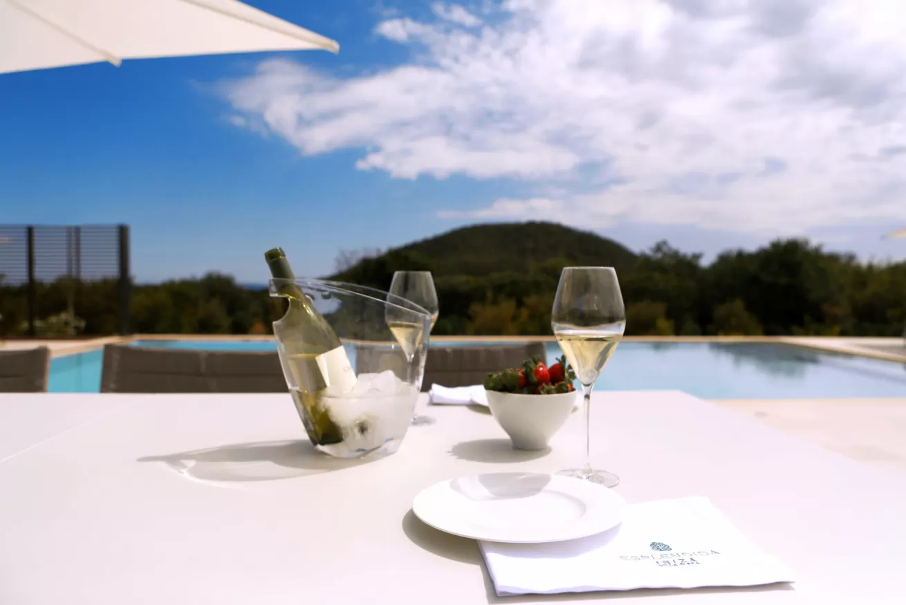 La piscina é magnifica, dotata di fantastici lettini per sdraiarsi al caldo sole ibizenco. Accanto alla piscina c’é un tavolo da pranzo, e tutto intorno un immenso giardino.