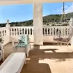 Dall’ingresso la prima visuale fantastica si ottiene dalla terrazza nella zona piscina che conduce fino alla porta di ingresso. La pietra grigia che fa da cornice la rende magica.