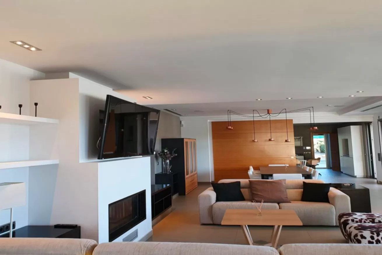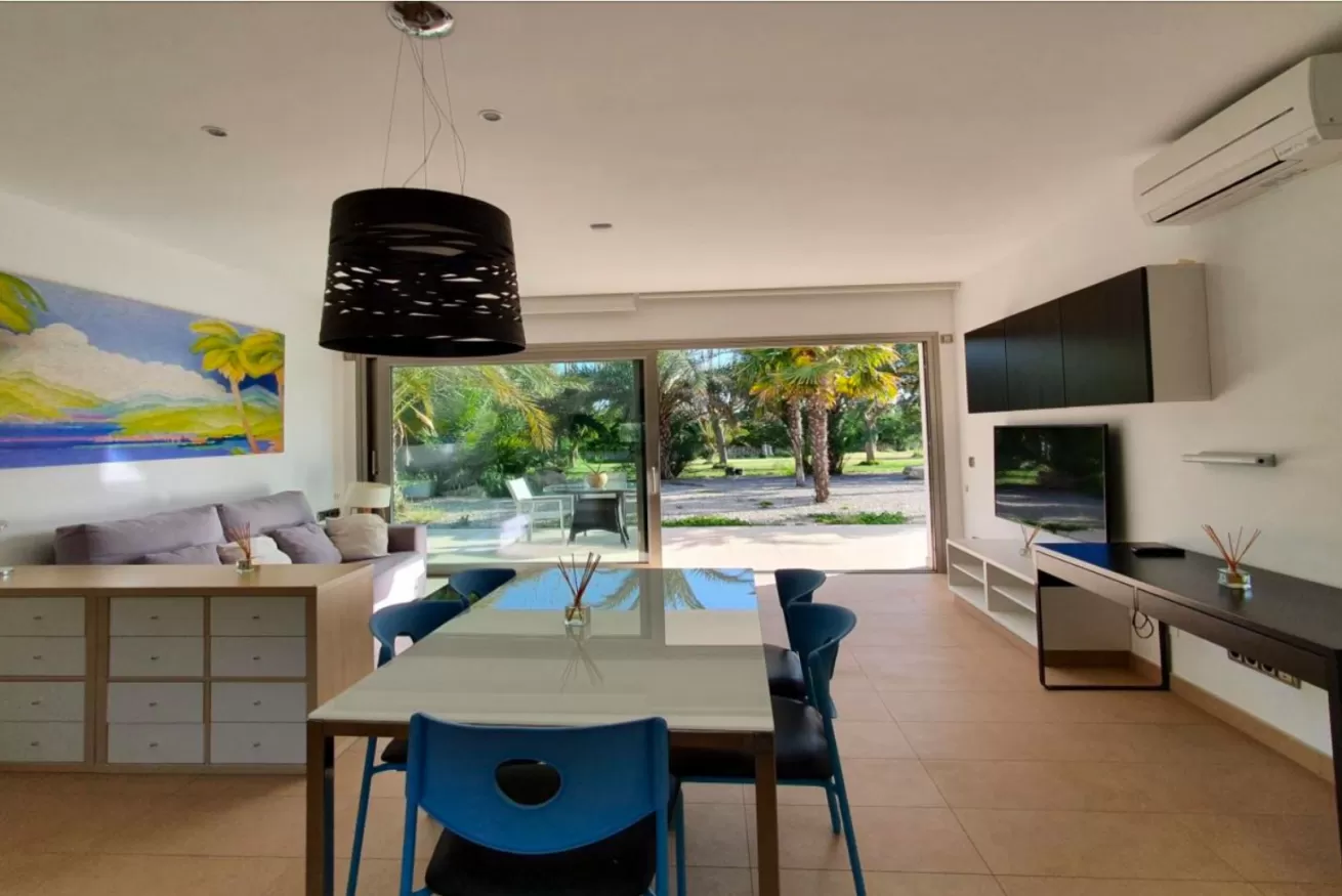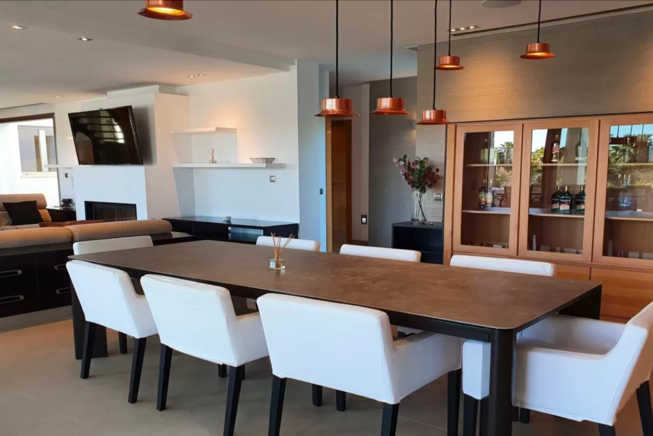 Dalla zona pranzo, si accede alla zona giorno, il luogo ideale per rilassarsi e da cui si può godere di una vista spettacolare sulla piscina, sul giardino e su Dalt Vila grazie alle enormi finestre.