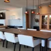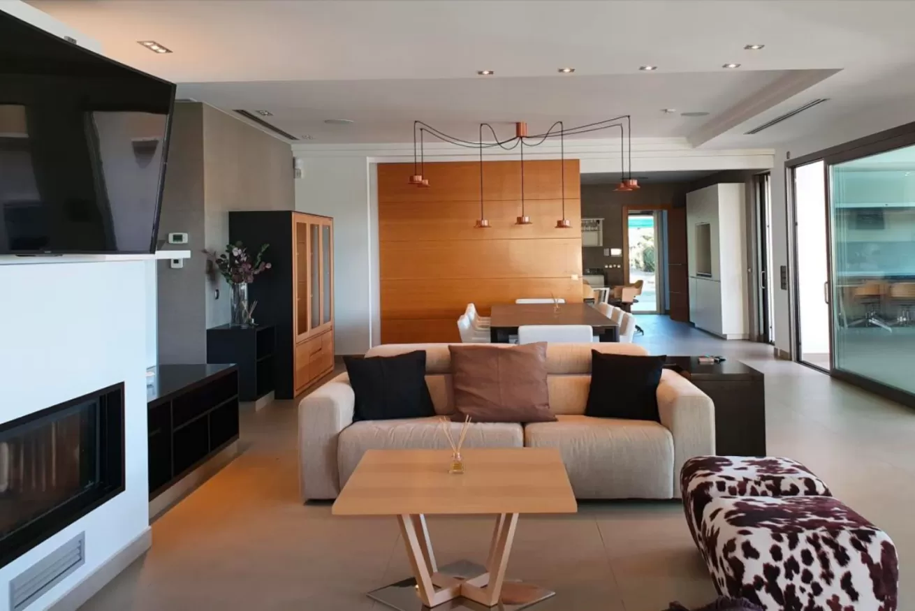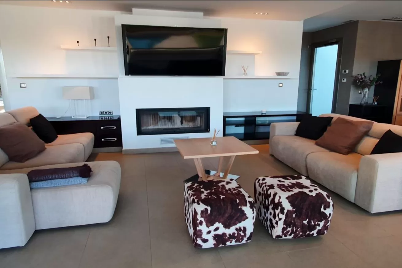 La zona giorno é arricchita da un secondo tavolo da pranzo, un camino e a una zona cinema per poter guardare i migliori film in uno spazio creato appositamente per il relax degli ospiti!