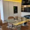 Dalla cucina si accede alla zona pranzo, che combina un arredamento in stile rustico con pareti in pietra, mobili in legno, pareti bianche e soffitti alti. La presenza di un pavimento a doppio livello in vetro, unico nel suo genere, dà un grande senso di spazio e permette di vedere parte del piano terra dall'alto e viceversa. Sempre dalla cucina si accede a una zona lavanderia, completamente attrezzata con tutti i servizi necessari.