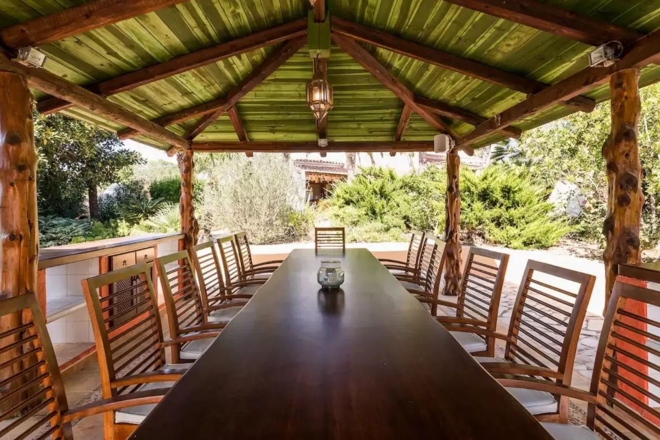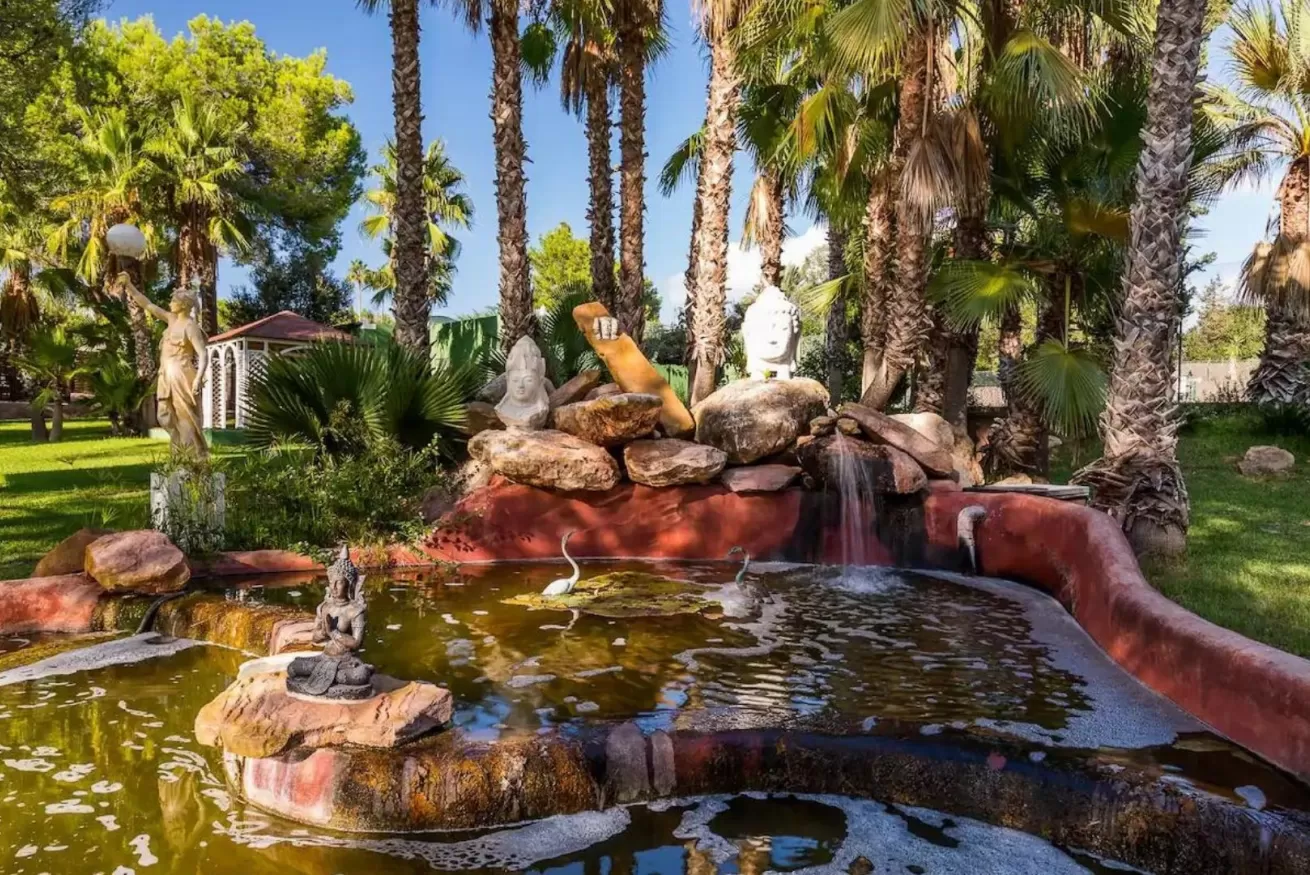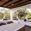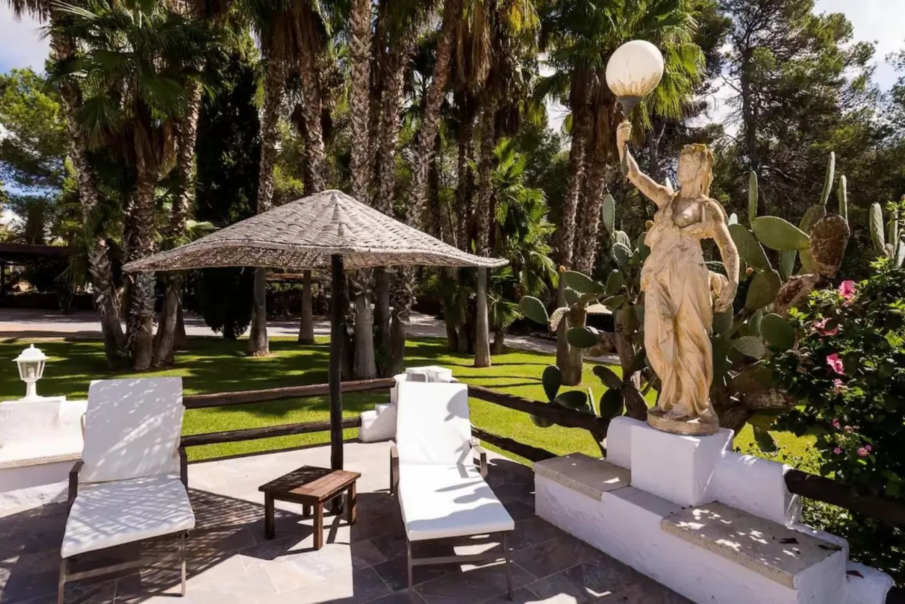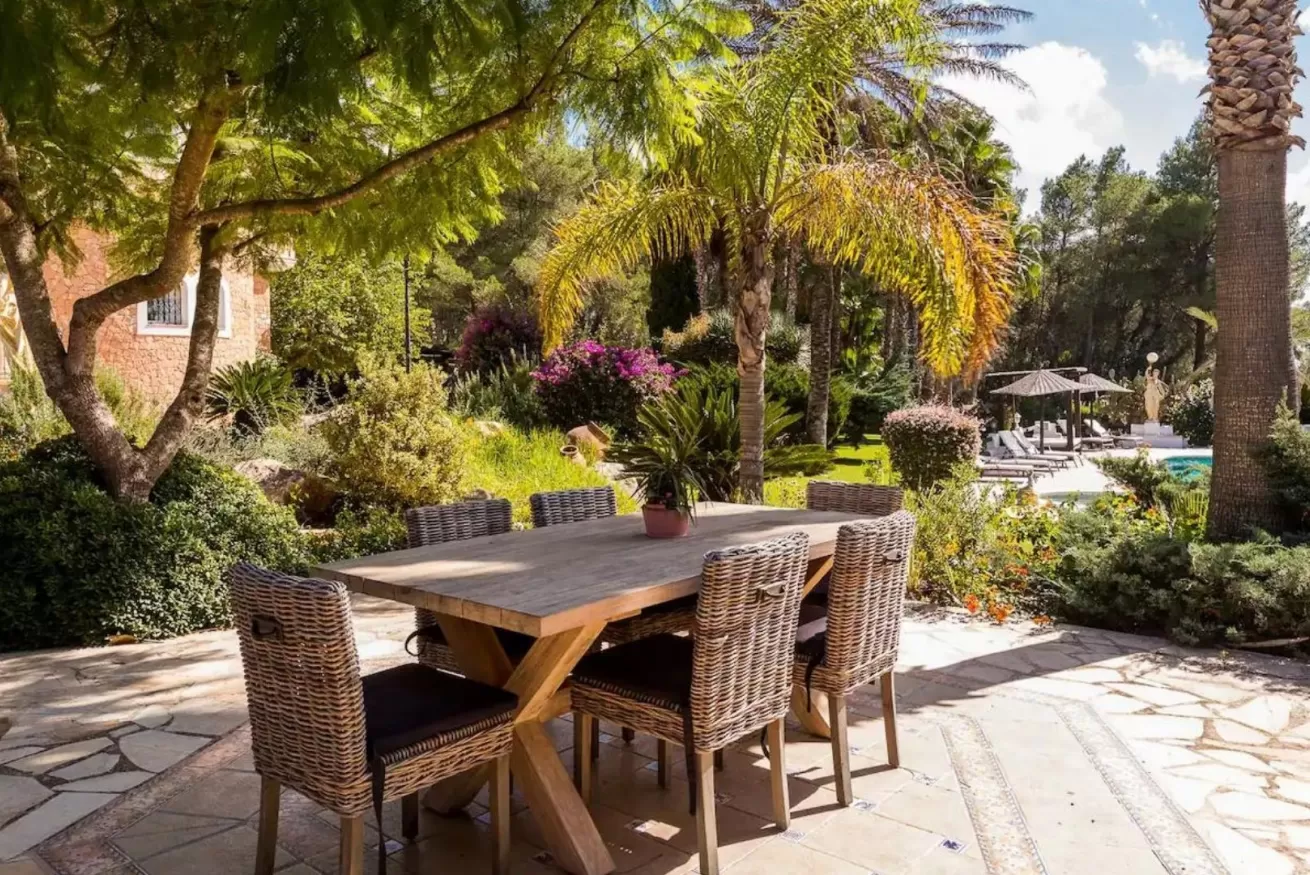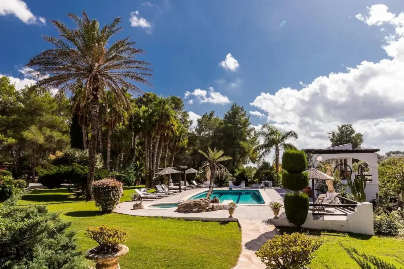 La villa ha un design unico: circondata da un enorme giardino, si estende su 3500 metri quadri di terreno in una tranquilla zona eco-agricola tra Cana Negreta e Santa Gertrudis.