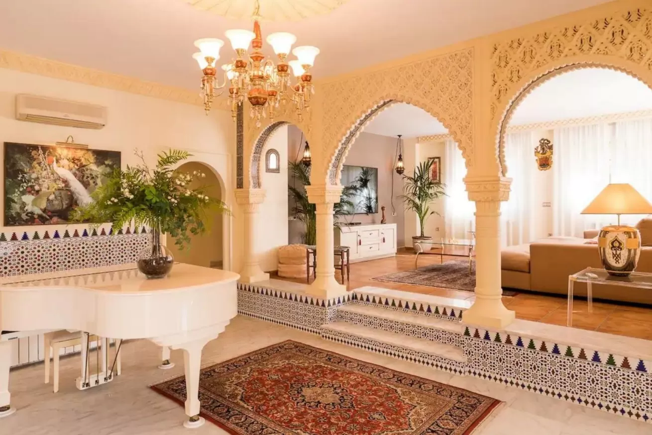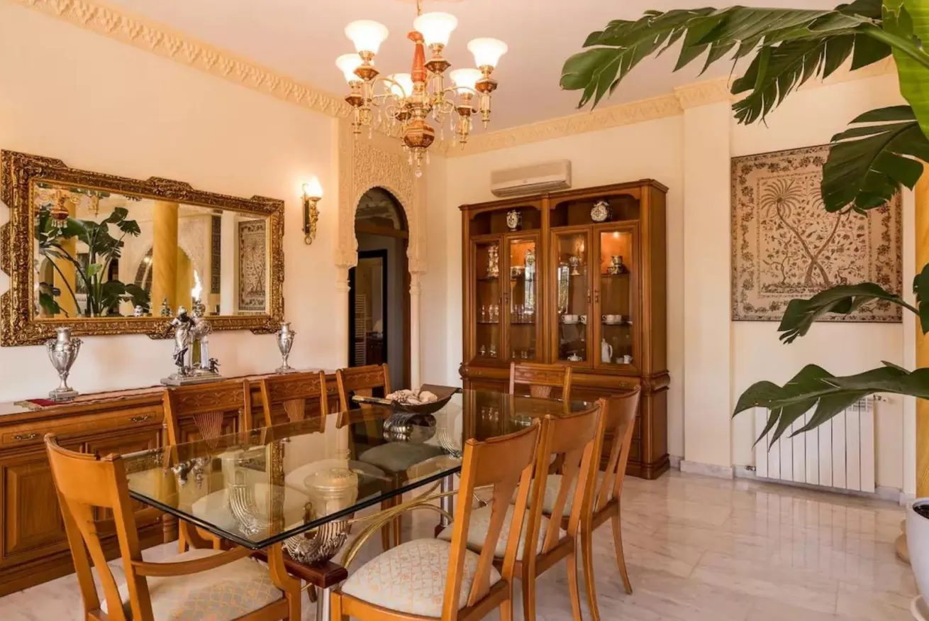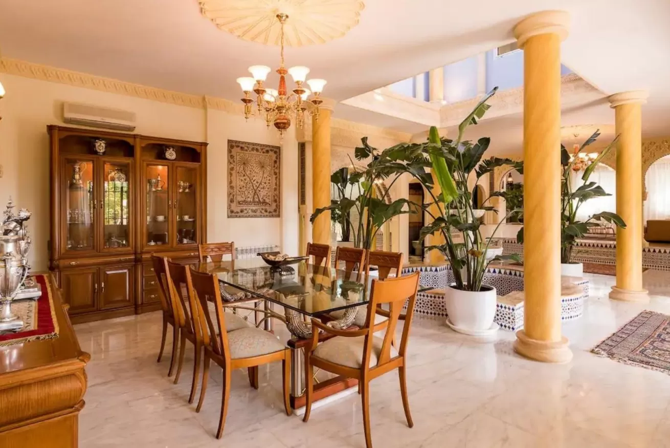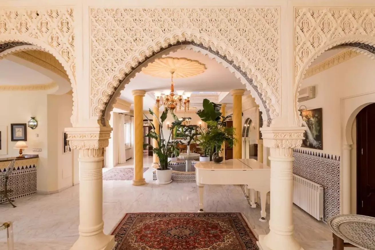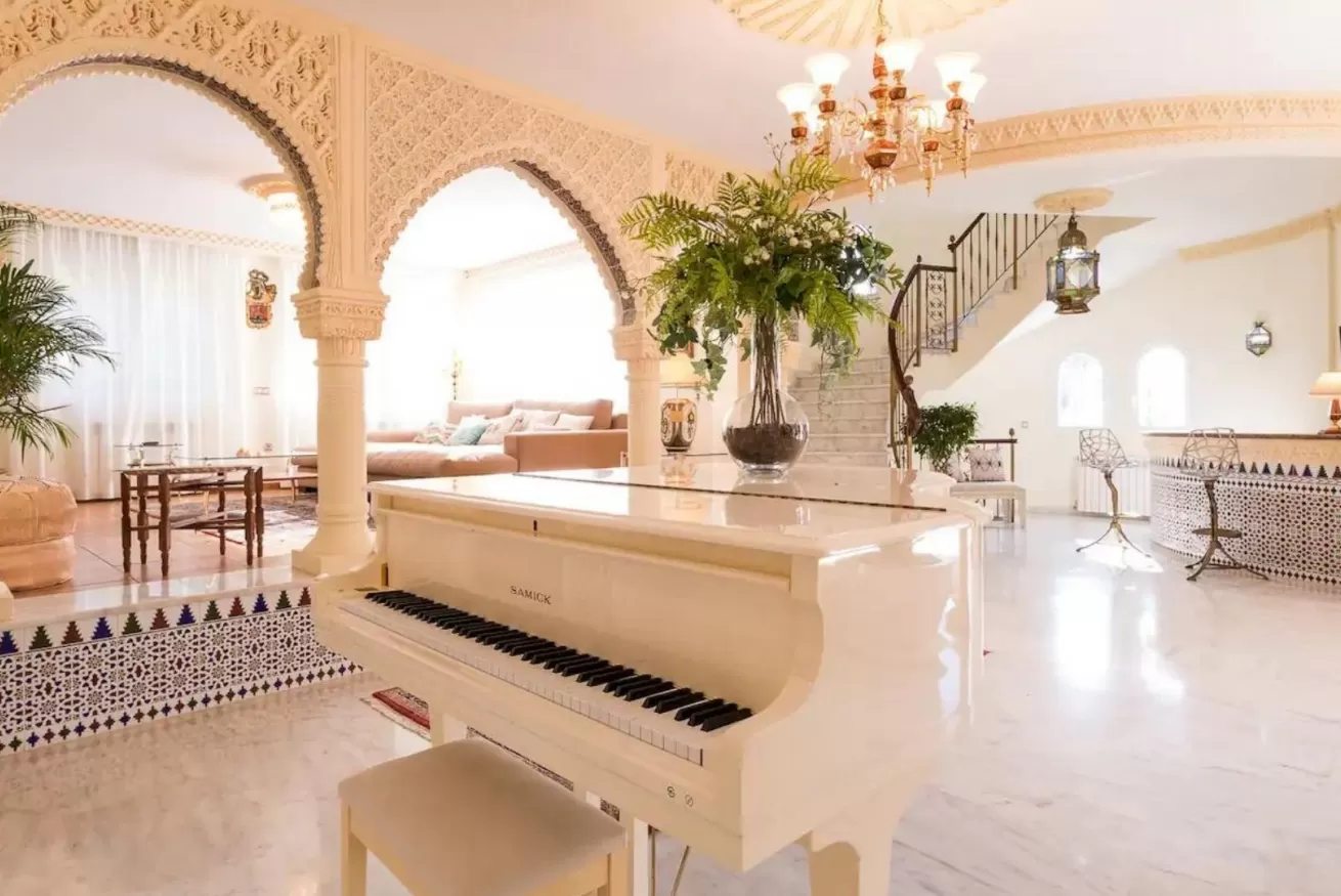 La zona giorno della villa si presenta elegante, con una cucina completamente moderna dotata di qualsiasi confort, e una zona relax intorno al camino. Ad attirare subito l’attenzione, poi, c’è un enorme soggiorno con architettura in rifinito stile marocchino. Lo spazio si arricchisce di elementi classici grazie alla presenza di una fontana e di uno splendido pianoforte a coda bianco.