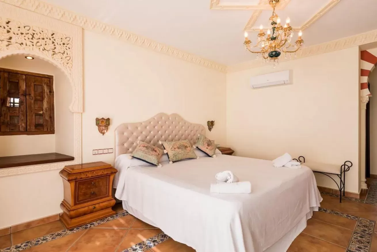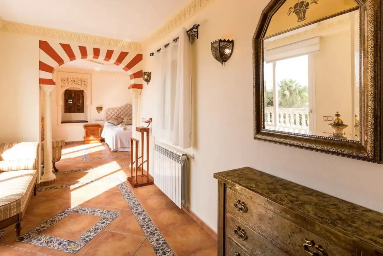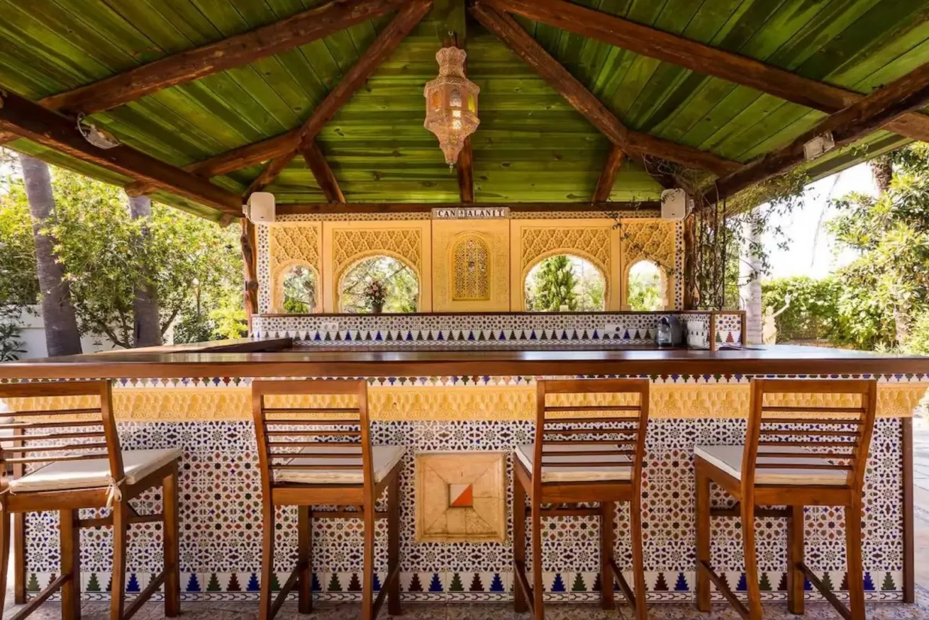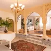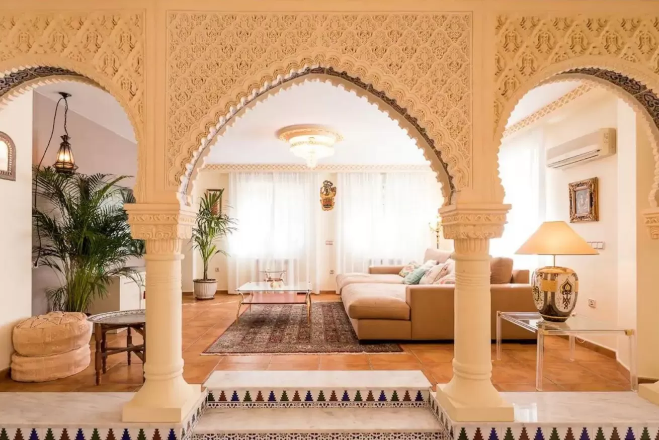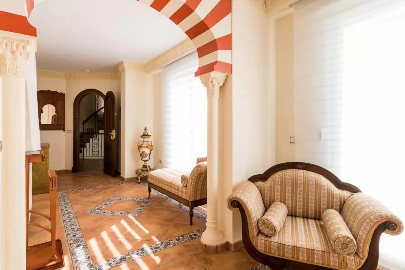 La zona giorno della villa si presenta elegante, con una cucina completamente moderna dotata di qualsiasi confort, e una zona relax intorno al camino. Ad attirare subito l’attenzione, poi, c’è un enorme soggiorno con architettura in rifinito stile marocchino. Lo spazio si arricchisce di elementi classici grazie alla presenza di una fontana e di uno splendido pianoforte a coda bianco.