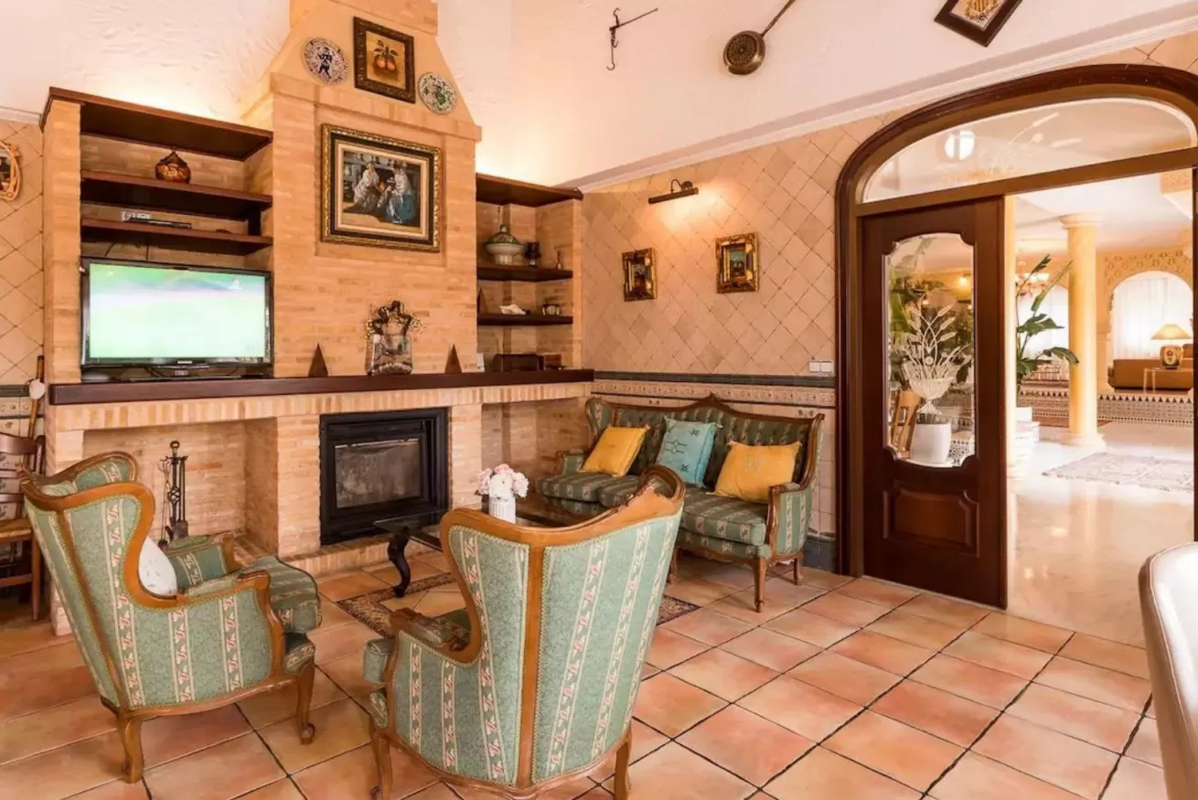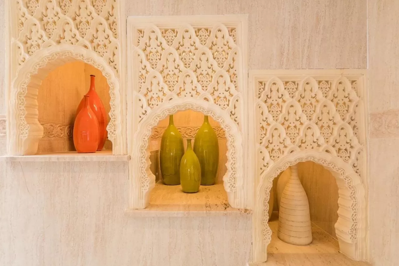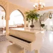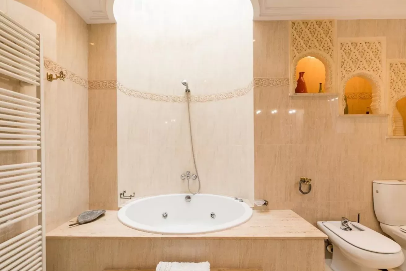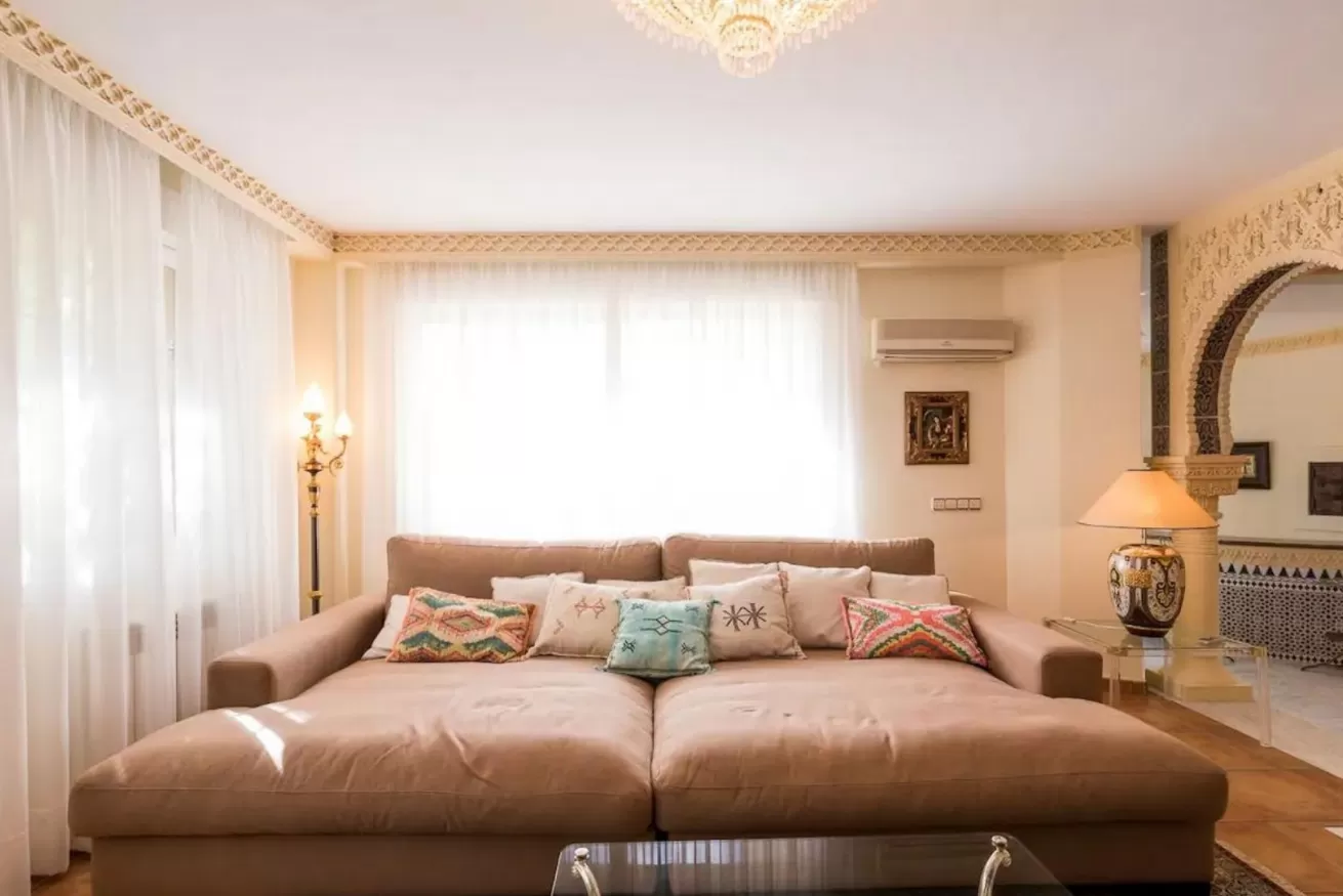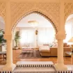 La zona giorno della villa si presenta elegante, con una cucina completamente moderna dotata di qualsiasi confort, e una zona relax intorno al camino. Ad attirare subito l’attenzione, poi, c’è un enorme soggiorno con architettura in rifinito stile marocchino. Lo spazio si arricchisce di elementi classici grazie alla presenza di una fontana e di uno splendido pianoforte a coda bianco.