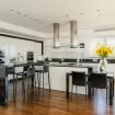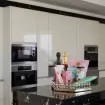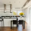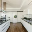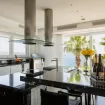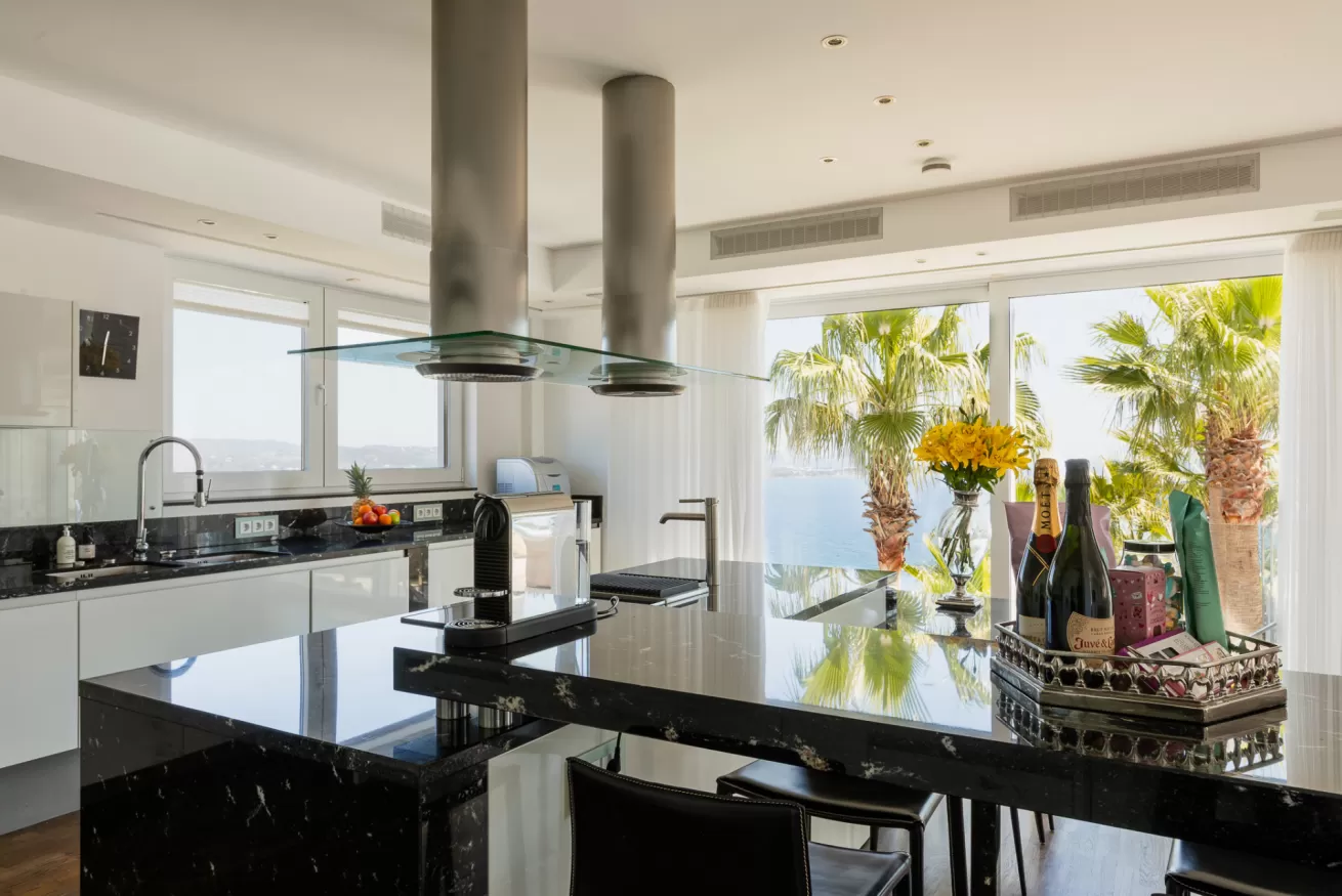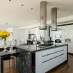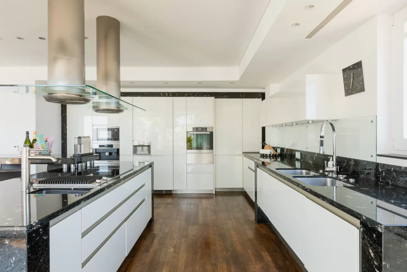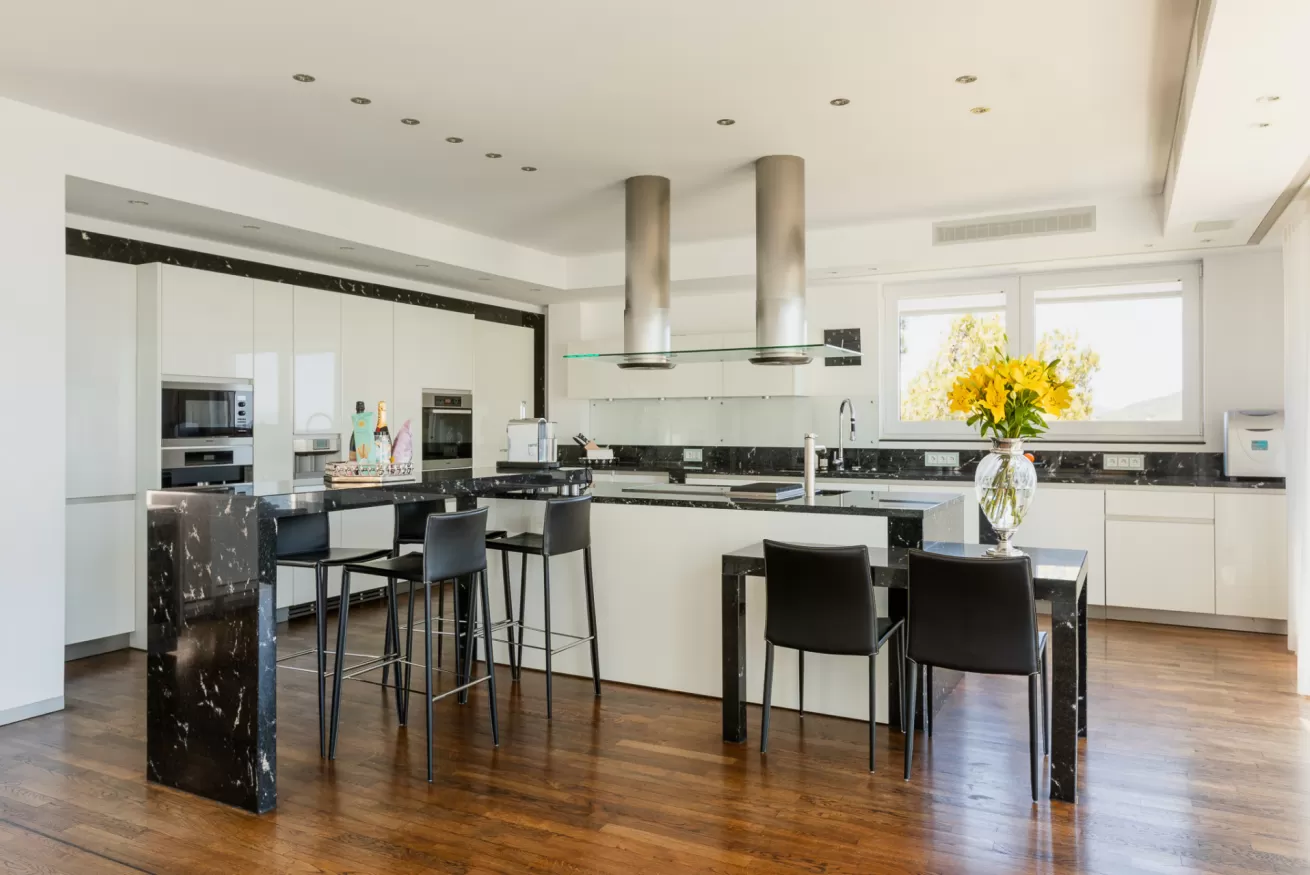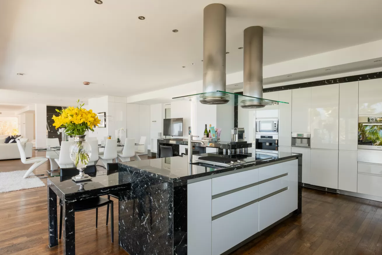 L’ampia cucina in stile americano è dotata di tutti gli elettrodomestici e di grande stile architettonico grazie al particolare marmo utilizzato per le rifiniture.