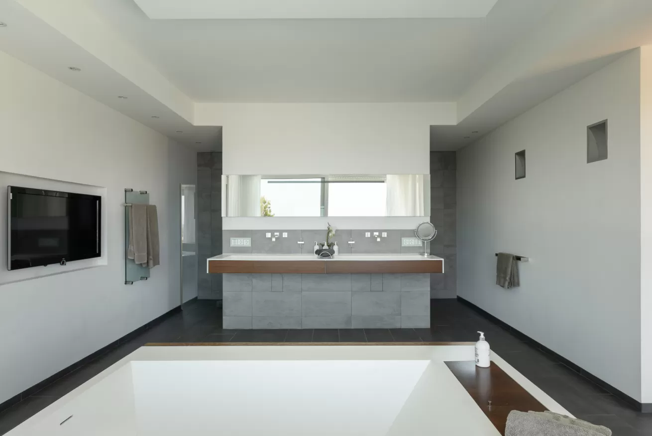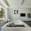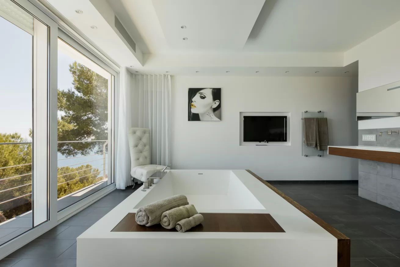 La master room con bagno en-suite è dotata di vasca da bagno panoramica e una camera matrimoniale con incredibile vista sul mare e sul paesaggio.