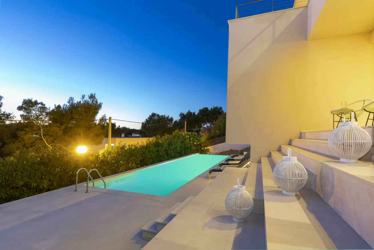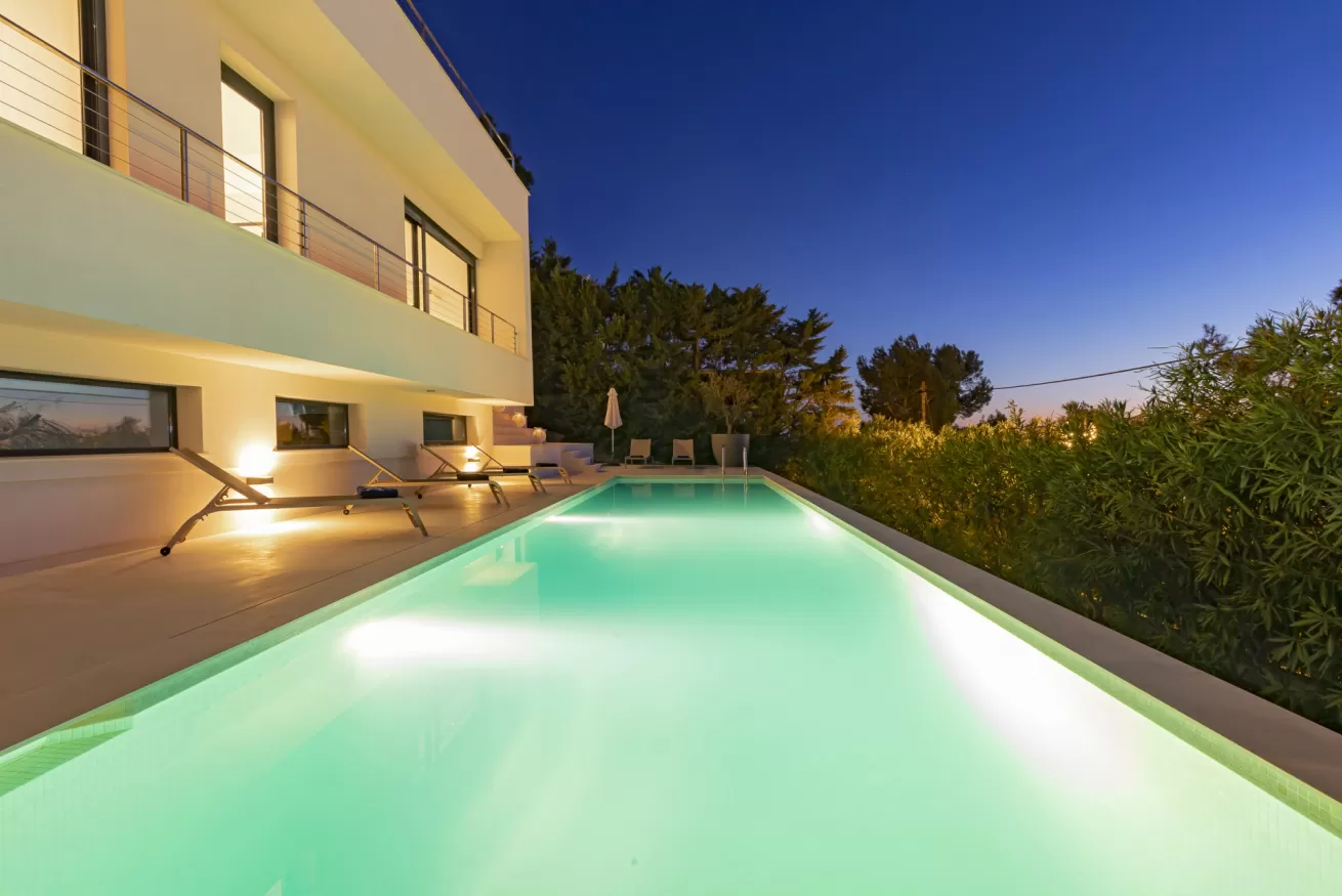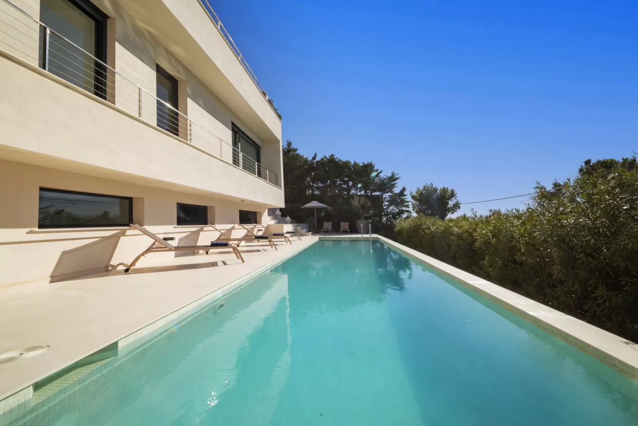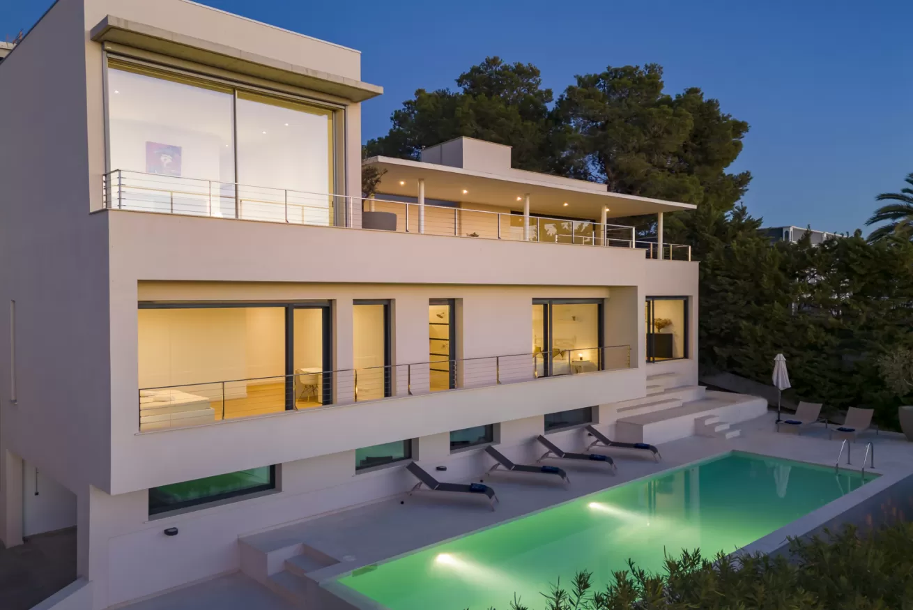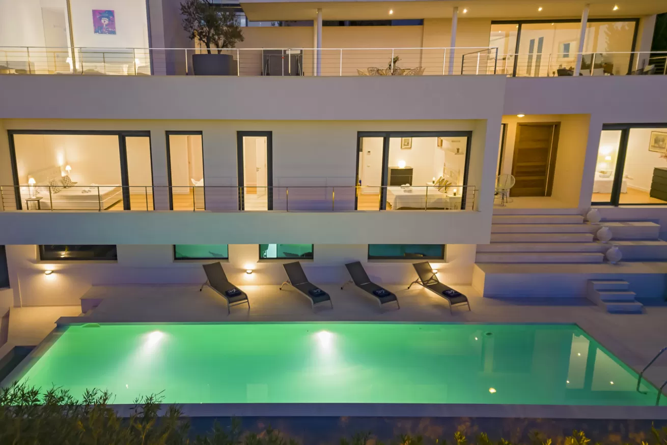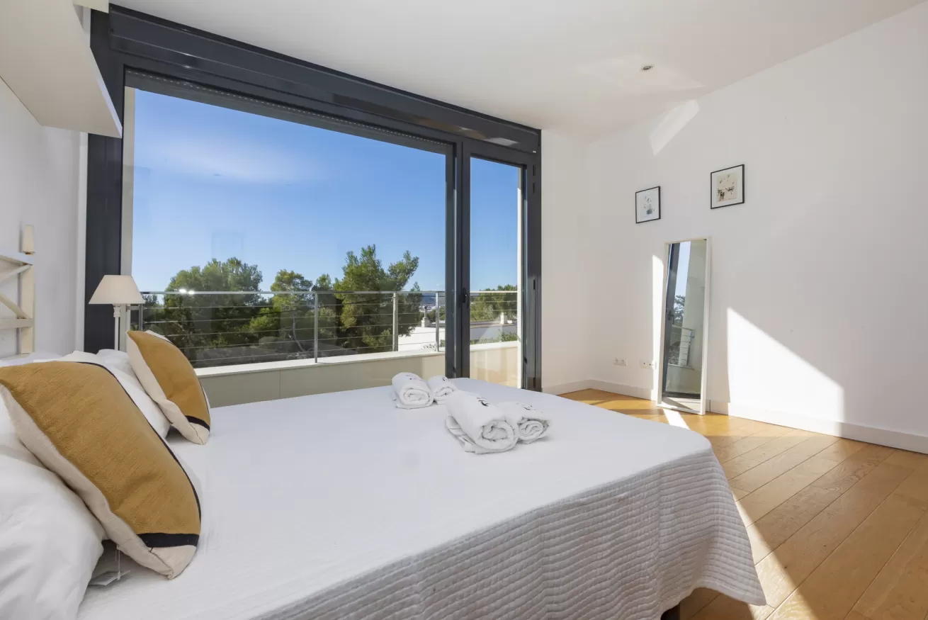 Villa Helga è una spettacolare villa di lusso contemporanea arroccata su una collina esposta a sud-ovest, che regala alcune delle migliori viste panoramiche di Ibiza: dalla baia di Talamanca alla storica Dalt Vila, fino al mare aperto e all’isola di Formentera. Situata a pochi minuti dal paesino di Jesus e a una decina di minuti dalla città di Ibiza, questa proprietà combina perfettamente comfort e accesso immediato alla vivace vita dell’isola. Distribuita su tre livelli e collegata da una scenografica scala in rovere oltre ad un comodo ascensore, Villa Helga è progettata per offrire un’esperienza di soggiorno esclusiva. La villa dispone di cinque camere da letto eleganti, tre delle quali con bagno en-suite, oltre a un ampio bagno condiviso. Tutti gli ambienti sono dotati di aria condizionata e sistema di climatizzazione a pavimento regolabile individualmente, per garantire il massimo comfort in ogni stagione. Gli interni luminosi e moderni sono pensati per valorizzare la vista mozzafiato. Il grande spazio open space che unisce cucina, sala da pranzo e soggiorno crea un ambiente raffinato e conviviale, perfetto per intrattenere amici e familiari. Le grandi vetrate permettono alla luce naturale di inondare la casa, mantenendo sempre lo sguardo rivolto verso il panorama. All’esterno, una splendida piscina privata di 13 x 3,5 metri riflette la luce del sole e invita a rinfrescanti tuffi nelle calde giornate estive. Attorno alla piscina, comodi lettini prendisole offrono lo spazio ideale per rilassarsi, praticare yoga all’aria aperta o semplicemente godersi la tranquillità del paesaggio mediterraneo. Il piano superiore ospita una magnifica terrazza panoramica di 110 m², esposta a sud, con zona pranzo all’aperto perfetta per lunghe cene al tramonto mentre il sole cala dietro Dalt Vila. Ovunque ci si trovi, lo sguardo viene inevitabilmente catturato dalla vista spettacolare sul mare e sull’isola di Formentera. La villa dispone inoltre di garage coperto per due auto, parcheggio aggiuntivo nel vialetto e spazi dedicati allo staff, offrendo così comfort e praticità per soggiorni senza pensieri. Grazie alla sua posizione privilegiata, Villa Helga si trova a breve distanza da Clap, FIVE Destino, Sa Punta, la spiaggia di Talamanca e Marina Botafoch, nonché da negozi, ristoranti, bar iconici e alcune delle spiagge più belle dell’isola. Che tu voglia esplorare la vibrante vita notturna di Ibiza o semplicemente rilassarti in un ambiente esclusivo, questa villa rappresenta la base perfetta per vivere l’isola con stile. La proprietà si trova in una zona residenziale tranquilla; chiediamo pertanto agli ospiti di rispettare i vicini e di attenersi al rispetto e buone norme di convivenza con vicinato esclusivo. Eventuali segnalazioni o interventi da parte dei vicini o delle autorità potrebbero comportare la perdita parziale o totale del deposito cauzionale.