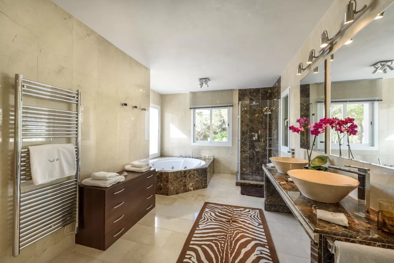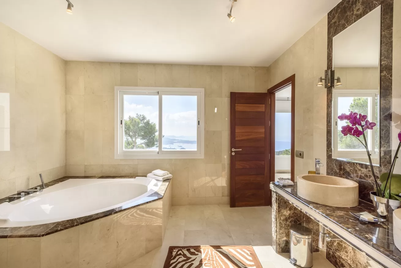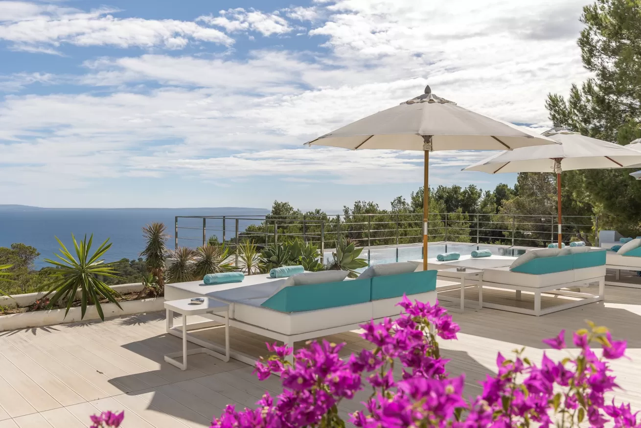 Outside, the elegant 9 x 5 m swimming pool and an impressive 170 m² solarium stand out, perfect for relaxing under the Ibizan sun.